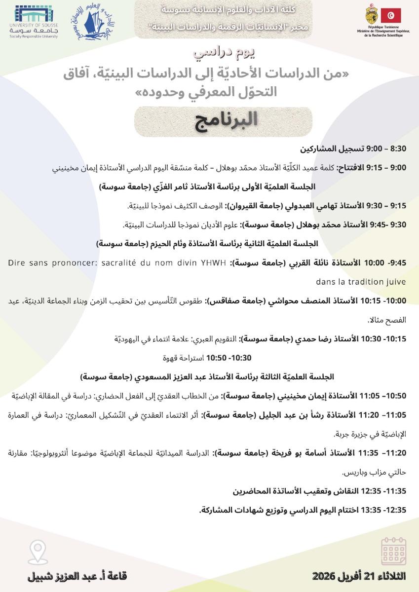تنظم كلية الآداب والعلوم الإنسانية بسوسة ومخبر "الإنسانيات الرقميّة والدراسات البينيّة" يوما دراسيّا يوم الثلاثاء 21 أفريل بقاعة الأستاذ عبد العزيز شبيل، ابتداءً من الساعة التاسعة صباحًا